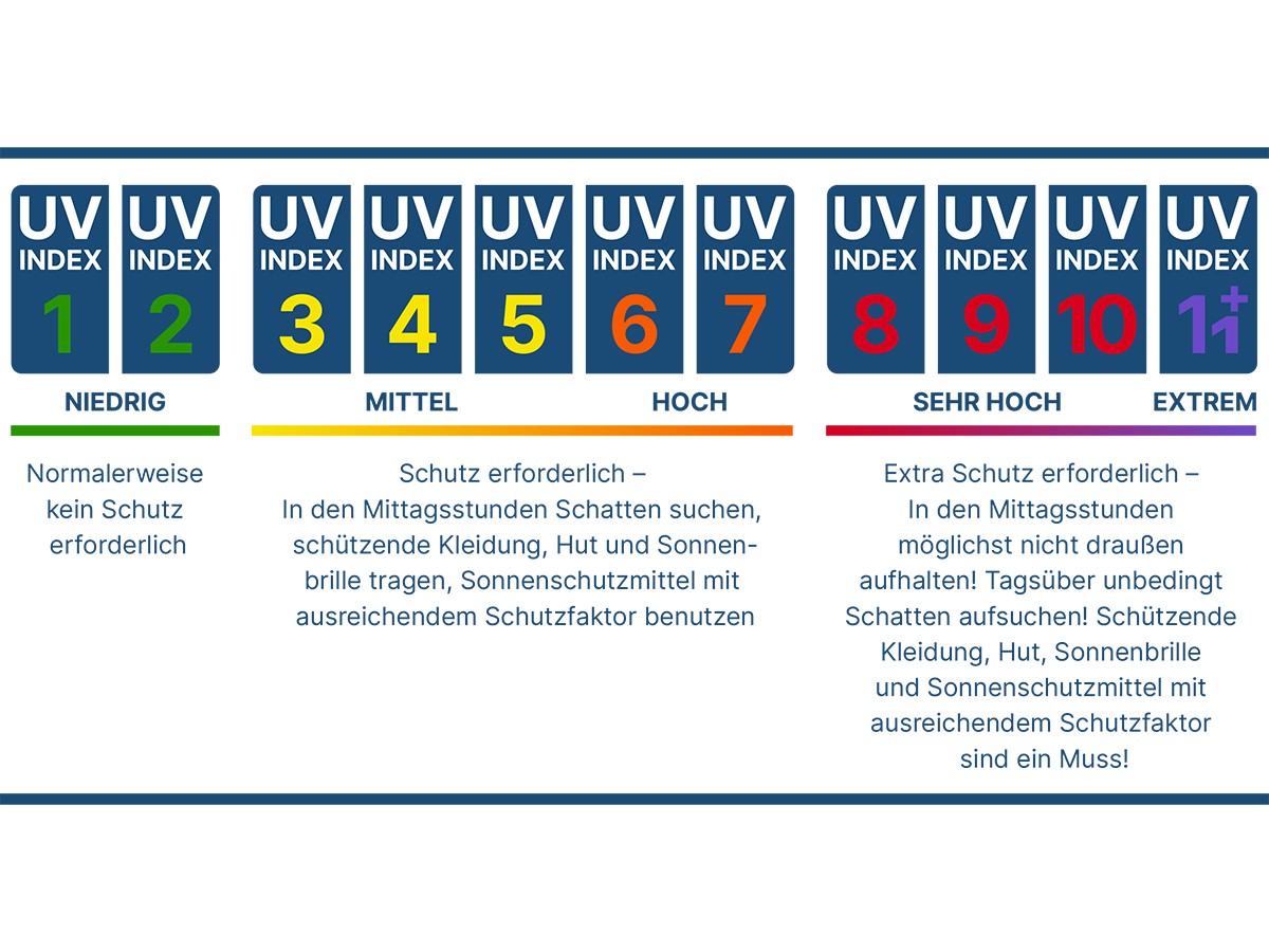 Ab einem UV-Index von 3 ist ein Sonnenschutz bereits erforderlich. Wetterapps auf Ihrem Smartphone geben den aktuellen UV-Index häufig an.